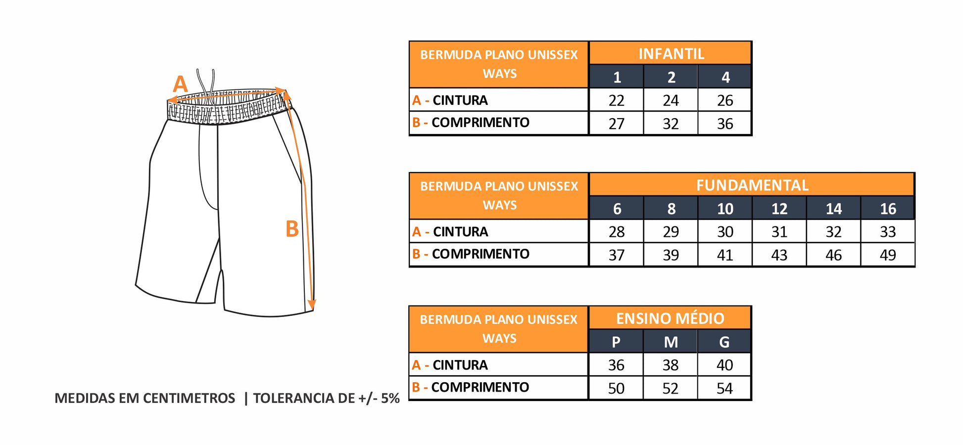 - Bermuda Plano Unissex confeccionado com tecido Macitel 100%Poliamida;