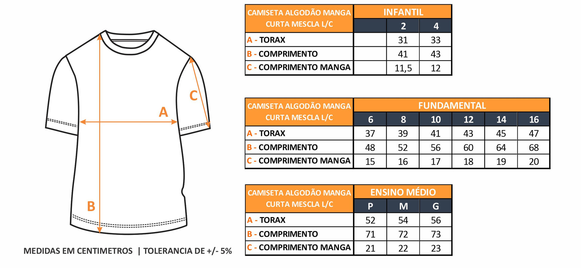 - Camiseta Unissex Manga Curta confeccionada com malha 88% algodão 12%poliéster;